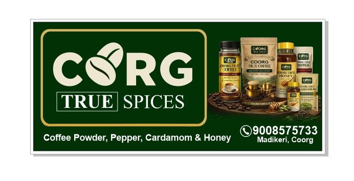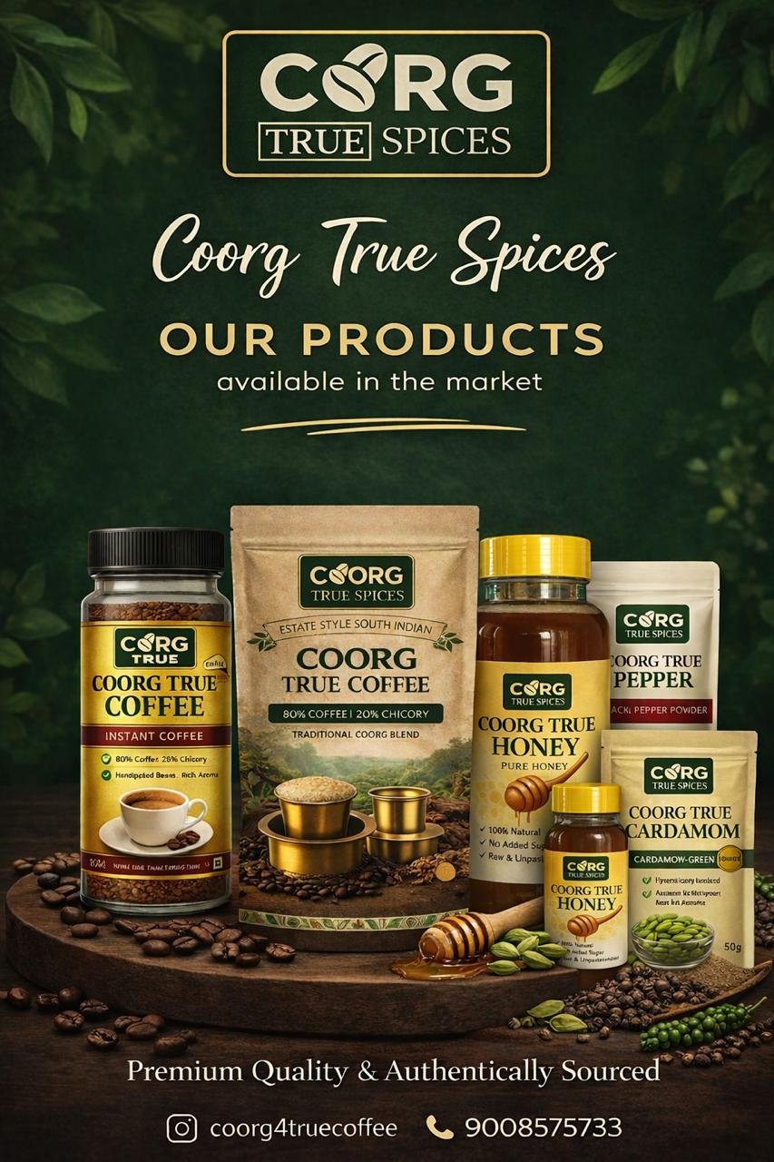 Coorg True Spices brings you the authentic flavors of Coorg with premium quality, naturally sourced products. We specialize in estate-style South Indian coffee, pure honey, aromatic green cardamom, and rich black pepper — carefully selected to deliver freshness, purity, and traditional taste in every pack.
